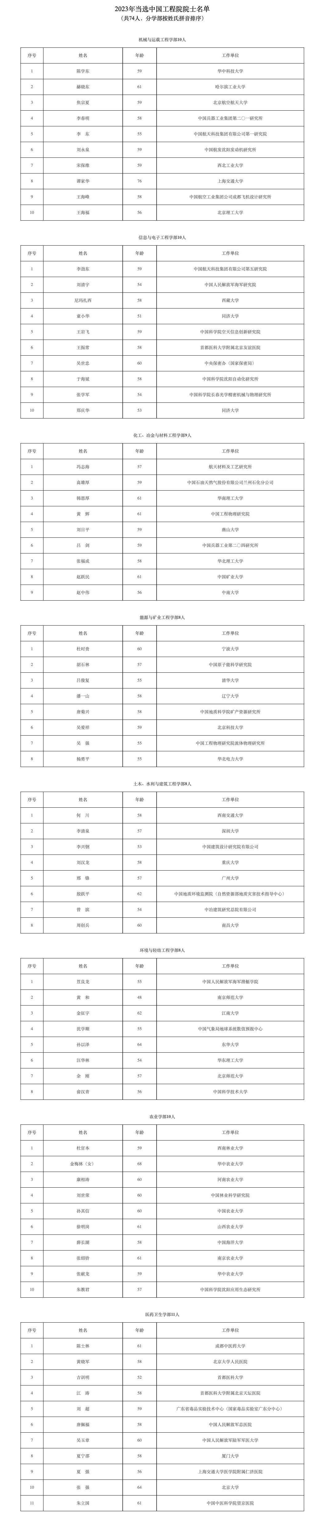 关于公布中国工程院2023年院士增选当选院士名单的公告
