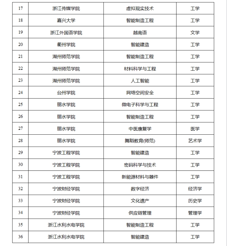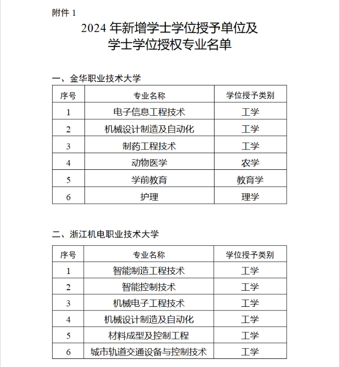 根据《浙江省学位委员会关于做好学士学位授权审核工作的通知》(浙学位〔2022〕4号)要求,经学校申报、专家评审、省学位委员会审议,拟新增金华职业技术大学为学士学位授予单位,其电子信息工程技术等6个专业为学士学位授权专业;新增浙江机电职业技术大学为学士学位授予单位,其智能制造工程技术等6个专业为学士学位授权专业;新增浙江工商大学“日语-国际商务”双学士学位专业1个;新增浙江大学生物育种科学等68个专业(含第二学士学位专业3个、建筑学专业学位专业1个)为学士学位授权专业,现予公示。