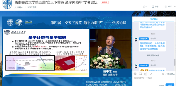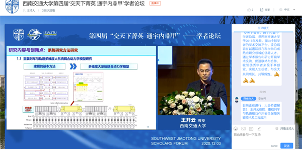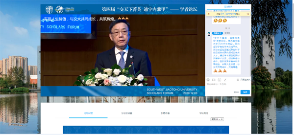 12月3日至10日,西南交通大学第四届“交天下菁英,通宇内鼎甲”学者论坛隆重举行,因疫情防控要求,论坛采取“线上+线下”的模式。本届论坛旨在诚邀活跃在科学前沿或热点研究领域的优秀人才,通过学术报告和研讨开展学术交流,促进联络与合作,吸引优秀学者来校干事创业,与交大共同成长。本届论坛由西南交通大学主办, 协办,提供专业人才服务和技术支持。论坛分为主论坛、分论坛两个部分,主论坛由学校党委组织部(人才工作办公室)主办,分论坛按照学科类别设置,由相关学院承办。
