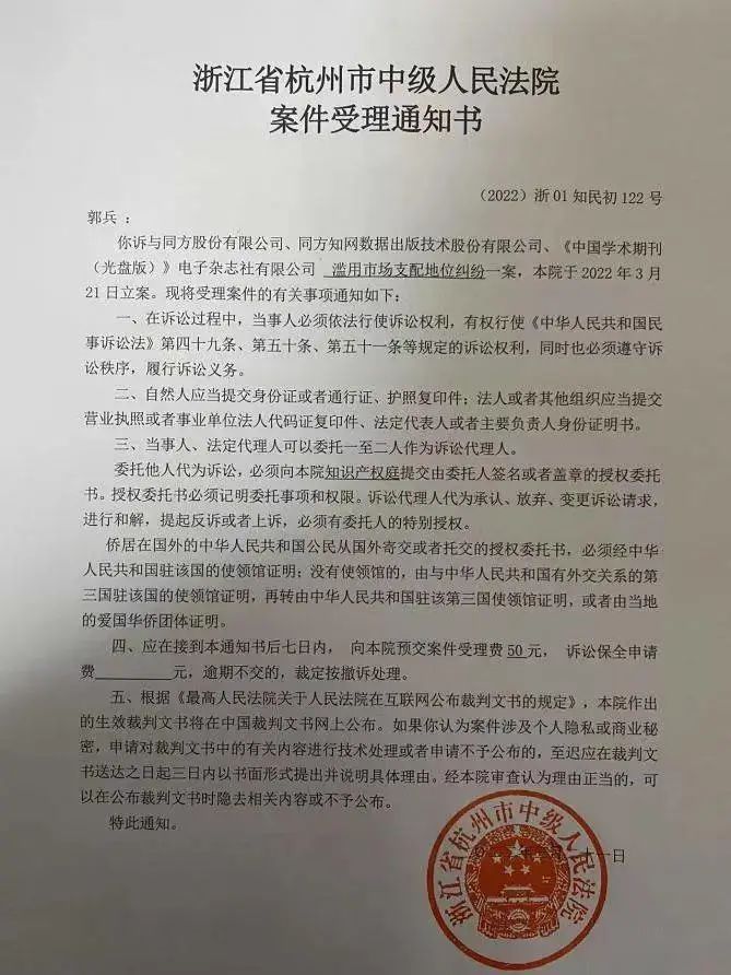 4月20日,红星新闻从浙江理工大学法政学院特聘副教授郭兵处获悉,其于去年12月提交的关于“中国知网滥用市场支配地位”的起诉材料,已于今年3月21日被杭州市中级人民法院正式受理。