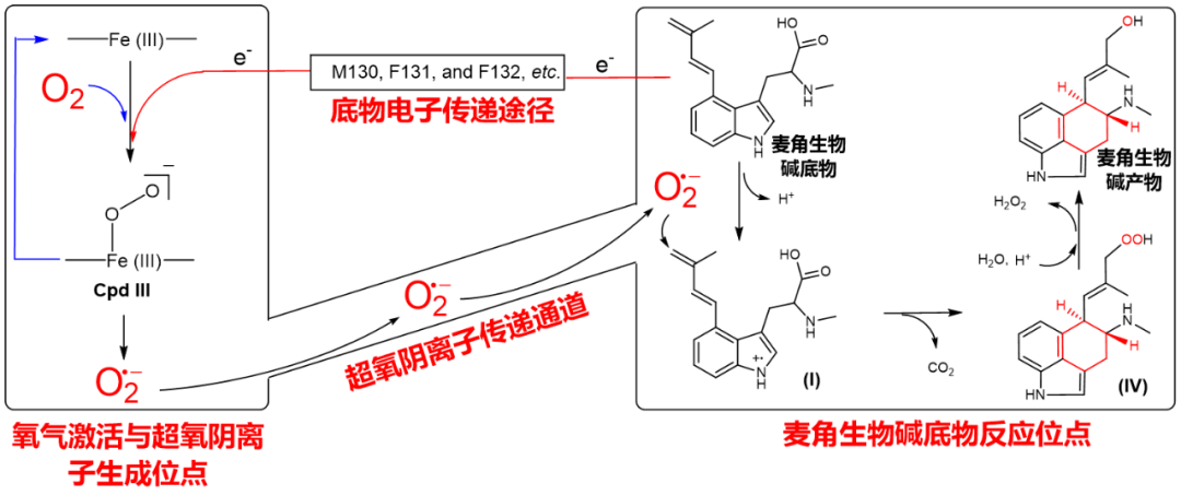 在研究中,EasC将麦角生物碱底物提供的一个电子传递给血红素结合区中的Fe(III)、后者同时和氧气结合形成Fe(III)-O2- (该复合体名称为Cpd III);Cpd III进一步分解成Fe(III)和超氧阴离子(O2•-)。该途径产生的超氧阴离子可以进一步通过超氧阴离子传递通道输送至麦角生物碱底物反应位点,催化一连串复杂的环化反应以生成麦角生物碱。