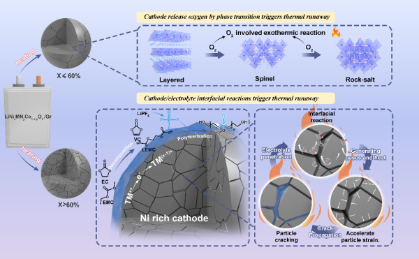 在电池热失控过程中,除了负极,高镍正极对电池热失控也具有重要影响。前期研究表明,在热失控过程中,正极引发的放热链式反应主要通过两条路径:一是体相结构失稳与氧释放,二是表界面副反应加剧。为提升电池安全性,是优先优化材料体相结构稳定性还是抑制界面副反应,这一相互交织的难题亟待破解。