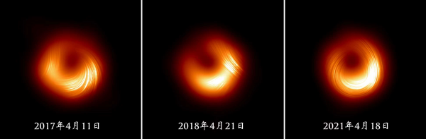 研究发现,2017年至2021年,偏振方向发生翻转。2017年磁场呈一方向螺旋,2018年相对稳定,而2021年完全反转。研究认为,这种偏振旋转方向的明显变化,或源于内部磁结构与外部效应的共同作用。偏振的演化反映出黑洞周围的湍动不止的环境,而其中磁场在物质如何落入黑洞以及如何向外释放能量方面发挥着关键作用。