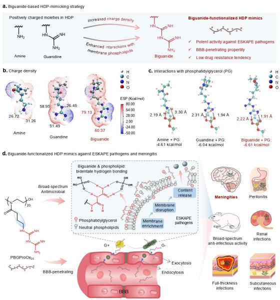 中国科学院苏州生物医学工程技术研究所提出了“双胍可作为新型宿主防御肽模拟物侧链正电荷基团”的创新策略。研究基于双胍官能团高电荷密度与强磷脂结合力的特性,实现了双胍化聚合物对ESKAPE耐药菌的高效广谱破膜杀菌性能,且长期处理不会诱导细菌产生耐药性与交叉耐药性。