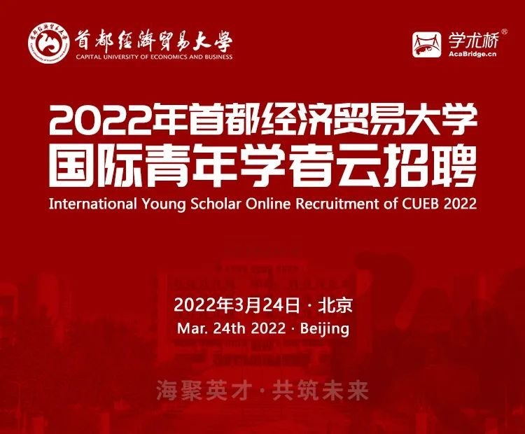 围绕全面建设“现代化、国际化、多科性、有特色的国内一流、国际知名财经大学”的目标,首都经济贸易大学聚焦经管类学术前沿,广纳国际贤才,发力学科建设,将于3月24日举办2022年国际青年学者云招聘活动。
