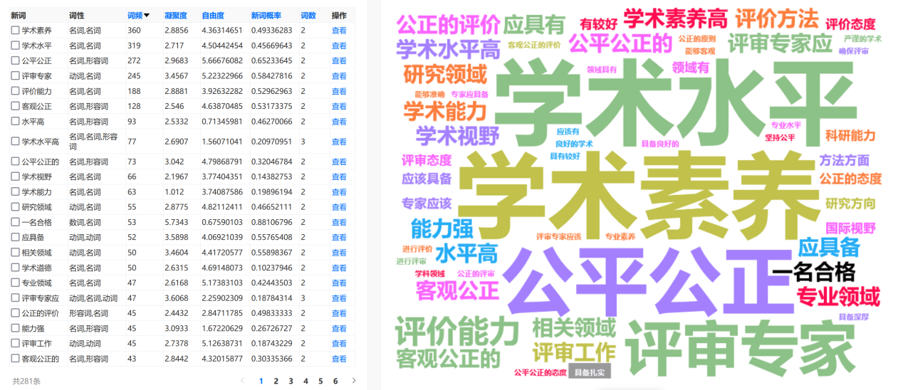 课题组又对热点词汇进行了统计分析,发现“学术”1470条、“评审”757条、“公正”734条、“评价”672条、“公平”599条等词汇排名前5位。再次印证了高质量的评审专家应该具备“学术”“公正公平”和“评审评价能力”等重要素质。