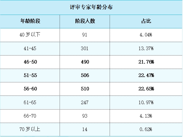 2252名评审专家的年龄分布从30岁到80岁不等,年龄分布呈现正态分布。其中,年龄分布最集中的在46-50、51-55、56-60三个阶段,即46-60岁的占到全部人数的66.88%。此外,45岁以下专家的占比为17.41%;60岁以上专家的占比为15.72%。这种年龄结构确保了评审具有较好的代表性。