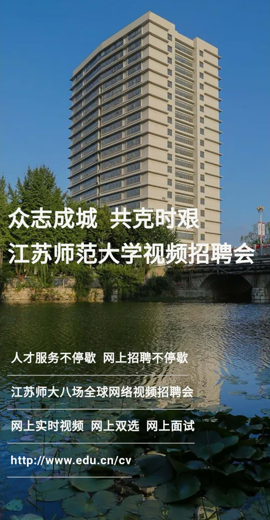 因为疫情,今年很特别。为进一步加大高层次人才引进力度,扎实做好疫情防控期间人才引进工作,确保人才引进工作“不掉线”。江苏师范大学积极为广大优秀博士人才提供求职就业的绿色通道——江苏师范大学拟于3月-5月间参加 举办的八个场次网络视频招聘会。经前期通过教育在线、 、Science、Wiley等媒介的广泛宣传,本场网络视频招聘会,江苏师范大学吸引了不少优秀学者关注和交流。