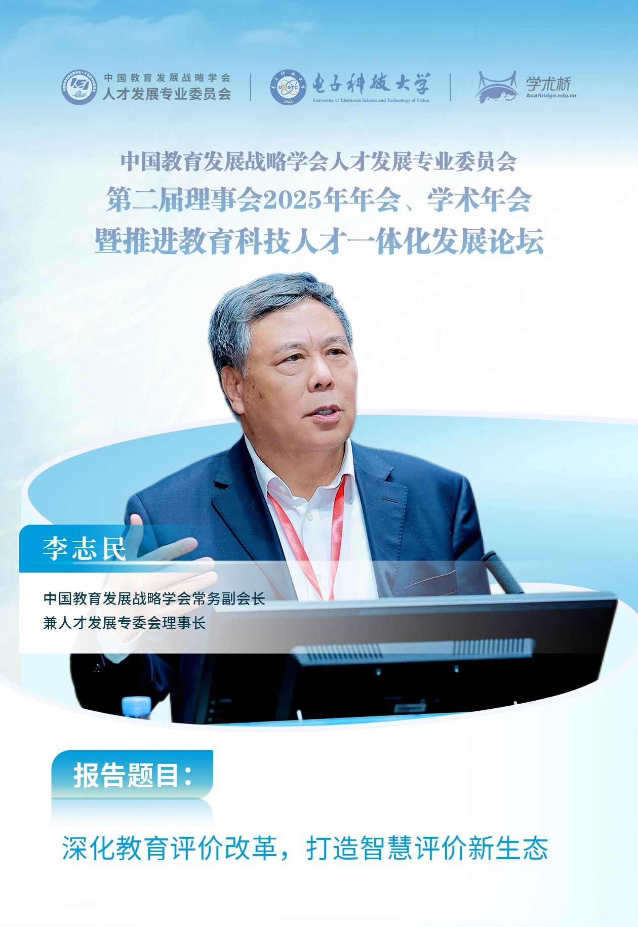 李志民聚焦教育评价这一指挥棒,深入探讨如何深化体制机制改革,强调深化教育评价改革是建设教育强国的核心驱动力,必须破除“唯分数、唯帽子”等顽疾,构建以创新能力、质量、实效和贡献为导向的多元评价体系,提出要充分运用现代信息技术,通过技术赋能构建智慧评价新生态,推动教育从“育分”回归“育人”本质,为教育科技人才一体化发展提供坚实支撑。